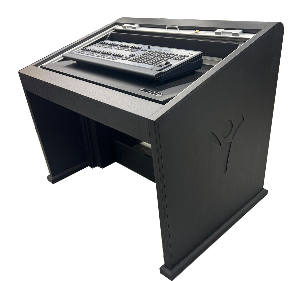 Inspirence Cyberbooth — A secure, motorized workstation designed for lighting and audio professionals. The Cyberbooth features a locking roll-top enclosure that protects control surfaces and gear, while its motorized adjustable-height deck transitions smoothly from seated operation to full standing position. Perfect for schools, auditoriums, and multipurpose venues, it delivers both protection and ergonomic flexibility in a sleek, professional form.